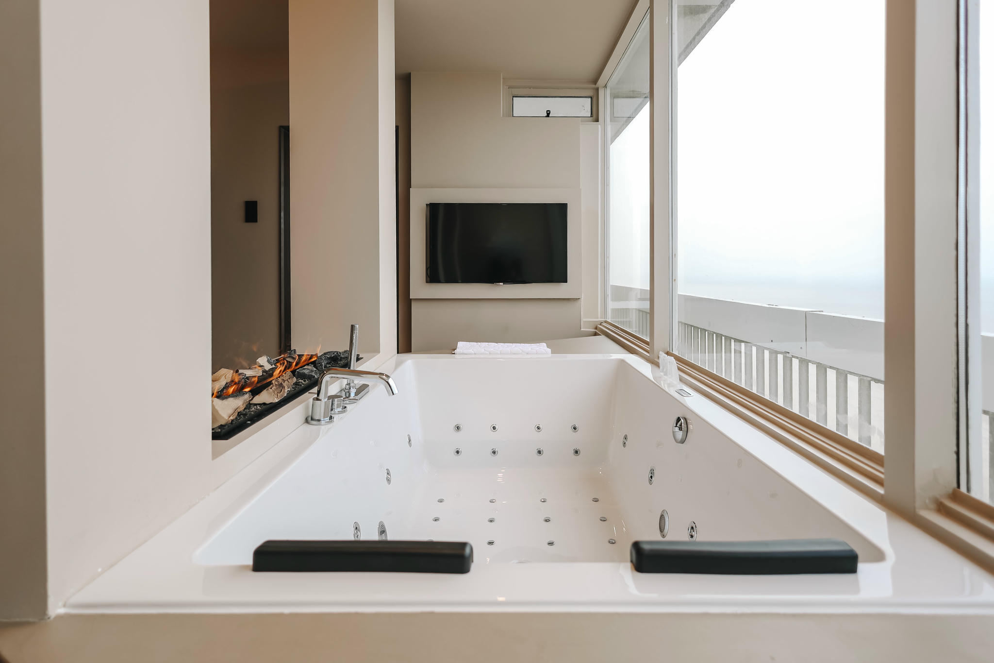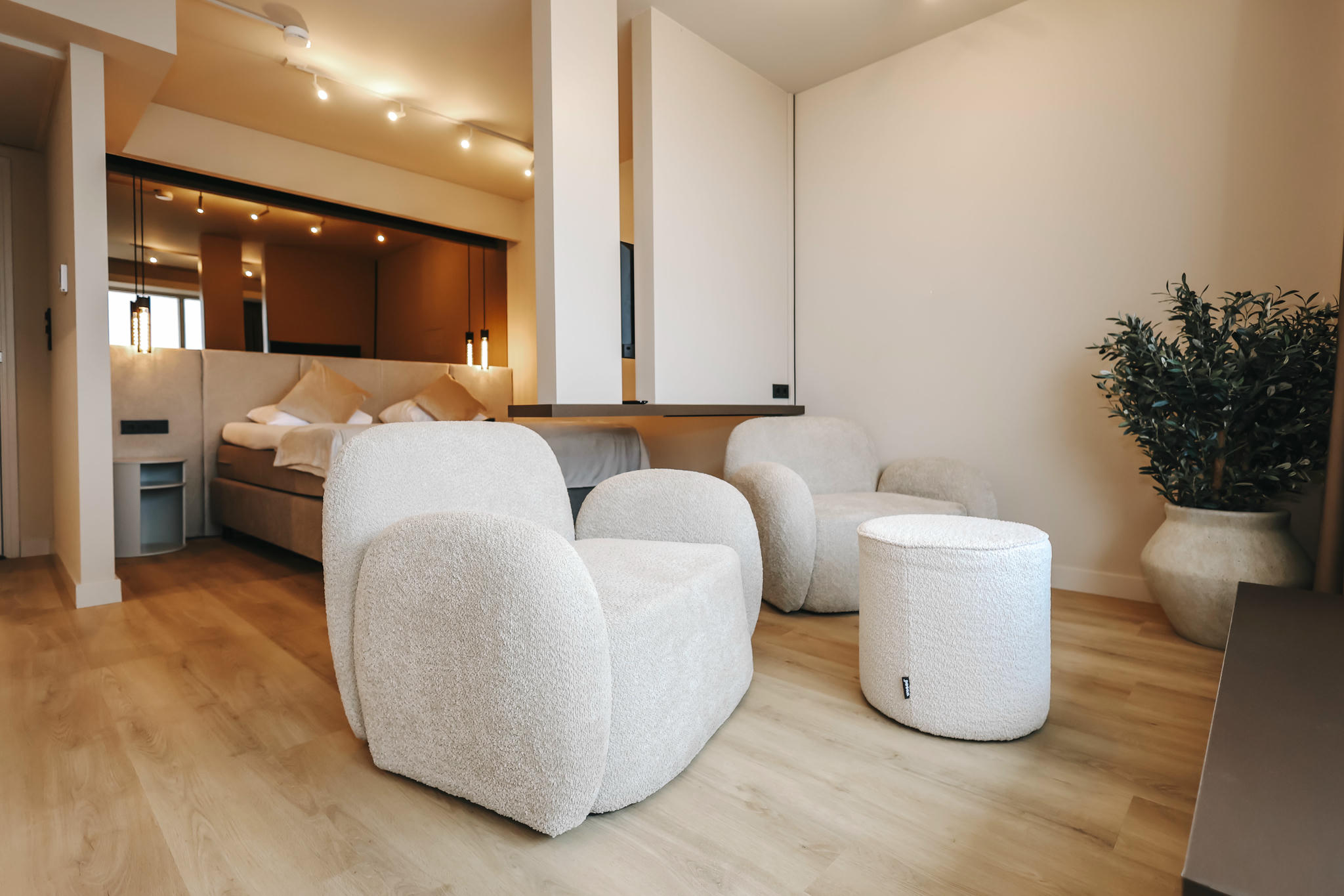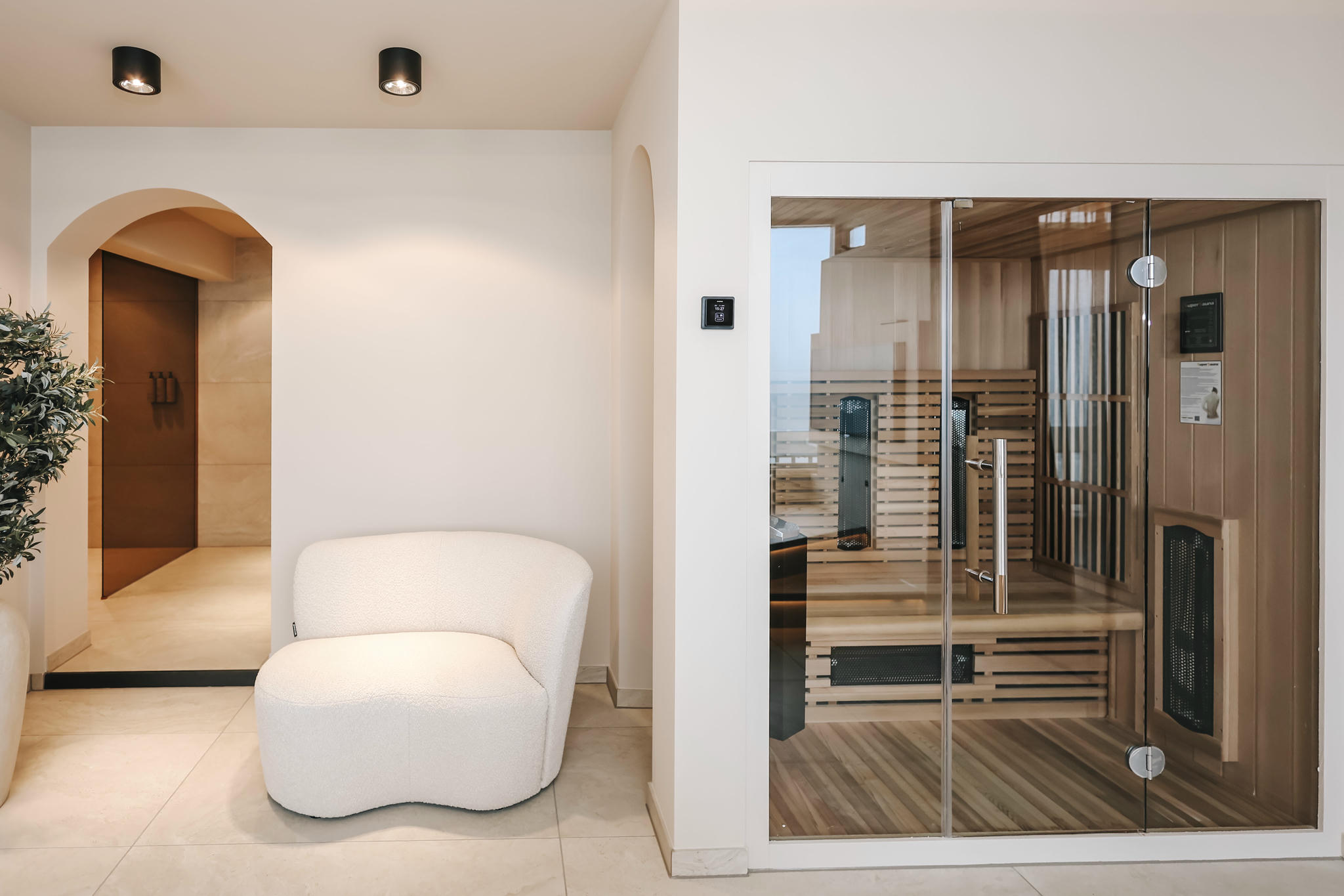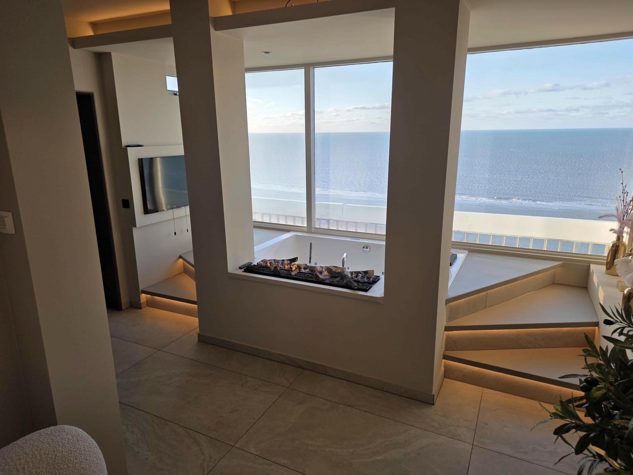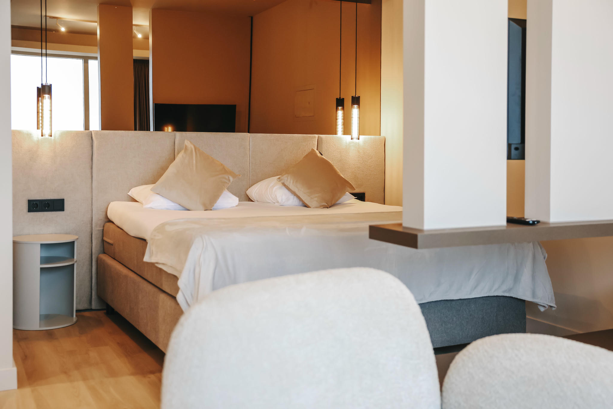 Experience pure indulgence in our exclusive Suite with breathtaking sea views and a spacious private balcony. Leave all your daily stress behind in the spacious private sauna or relax completely in the double jacuzzi, equipped with an extra television so you can enjoy your favourite films during your wellness moments.